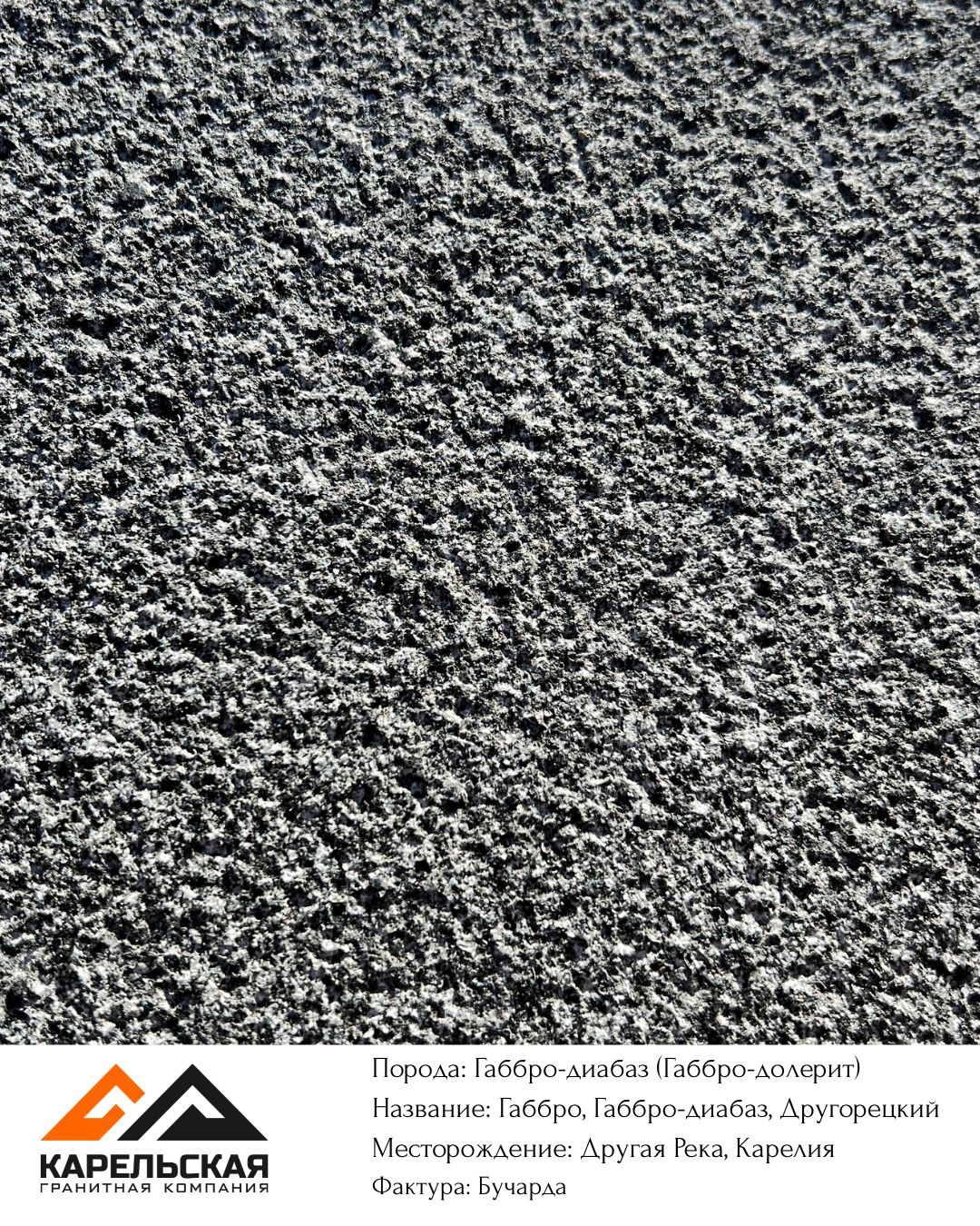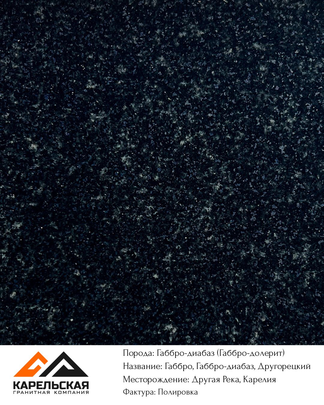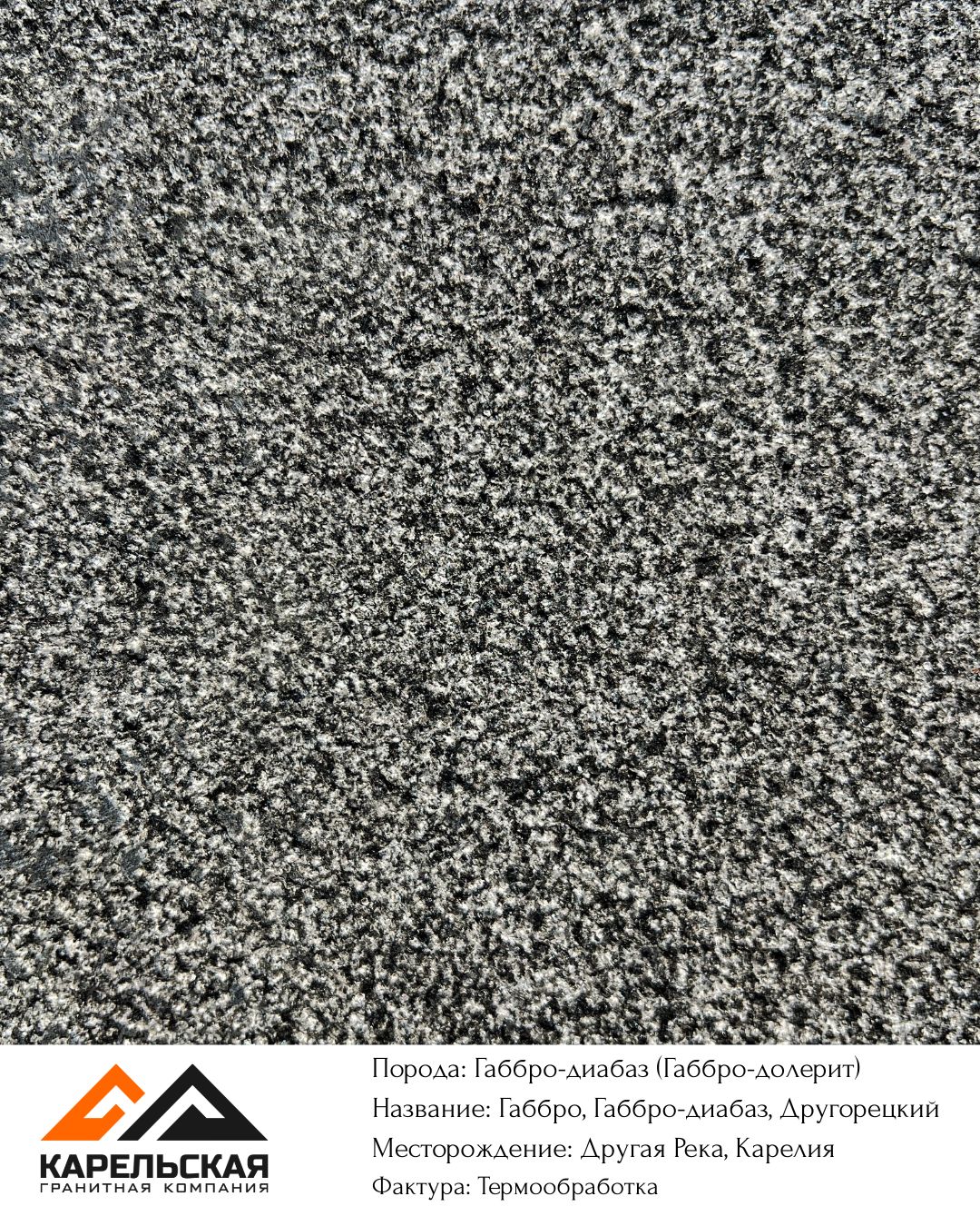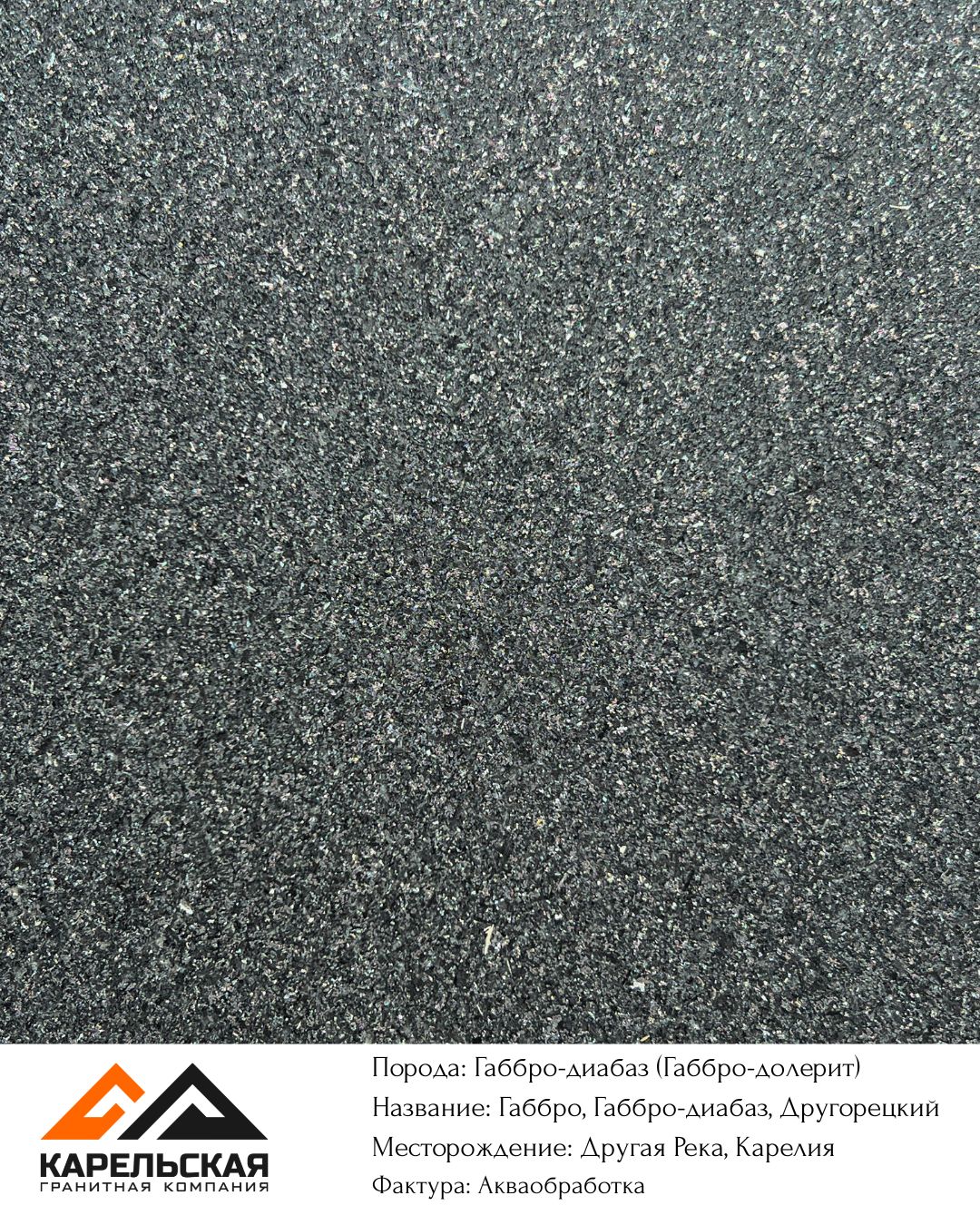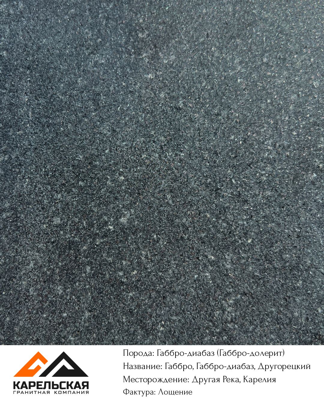 | Другорецкое: группа месторождений более 10 карьеров, пос. Другая река | Смешанный тип добычи: взрывной и канатный методы. Блоки доступны круглый год, разных размеров. Самое масштабное месторождение Карелии. | В полировке цвет габбро темно серый, черный, с включение светлых минералов, плагиоклазов. Цвет является особенностью месторождения. Термо — серый цвет. |